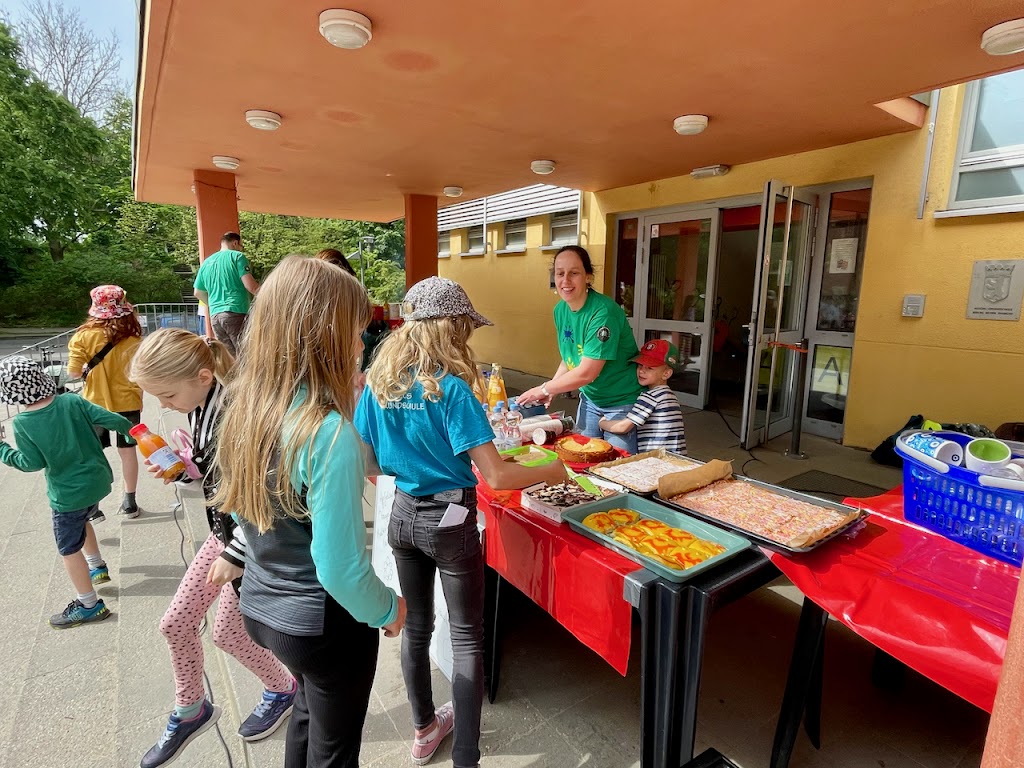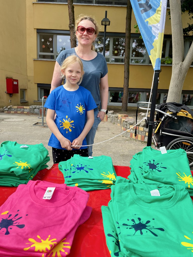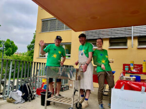 Während die Schüler und Schülerinnen mit ihren Familien Monsterkreisel und Marken-T-Shirts unter die Leute brachten, versorgten zahlreiche Helfer und Helferinnen des Fördervereins die Gäste mit Bratwürsten, Kuchen, Kaffee, Getränken und Schul-T-Shirts.