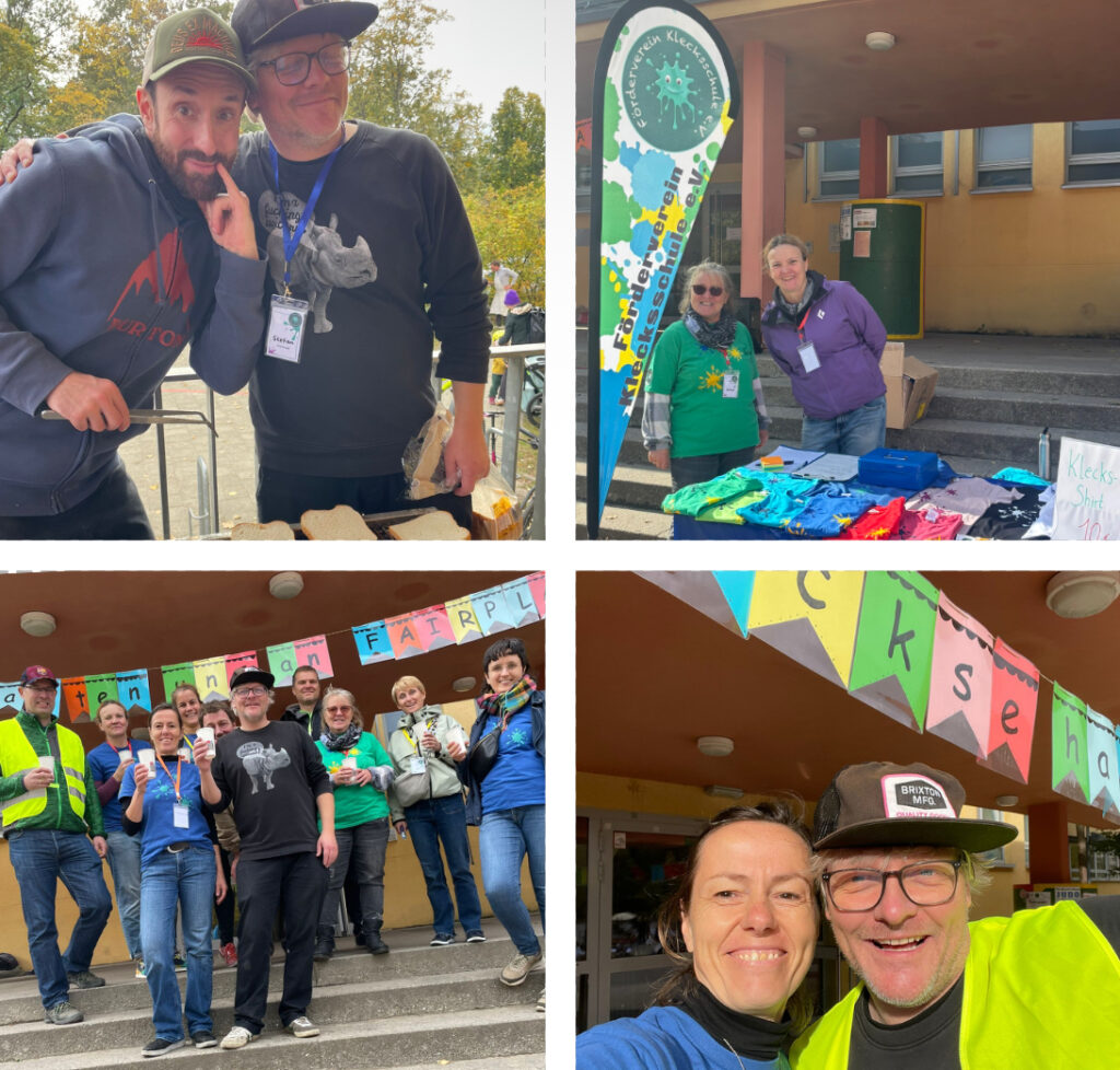 Engagierte Eltern, Lehrkräfte und Erzieher:innen sorgten gemeinsam als Förderverein Team für das leibliche Wohl. Bratwurst und Getränke waren im Angebot ebenso wie die beliebten Klecks T-Shirts.
